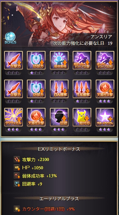 アンスリアはLBやEXリミットボーナス、エーテリアルプラス、アーティファクトで回避率を上げられるだけ上げています。