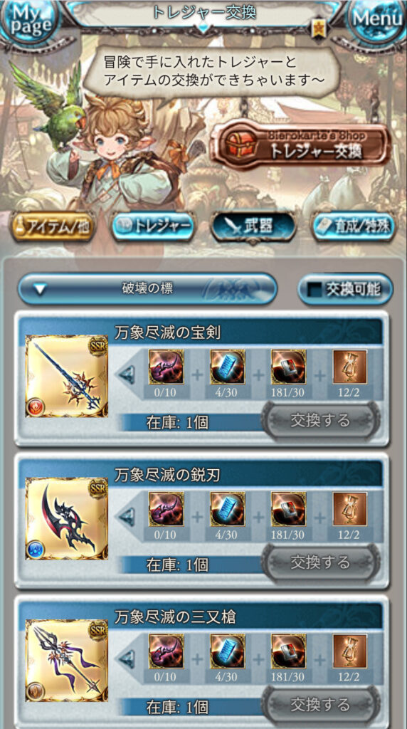 ショップのトレジャー交換、武器の高難度コンテンツ