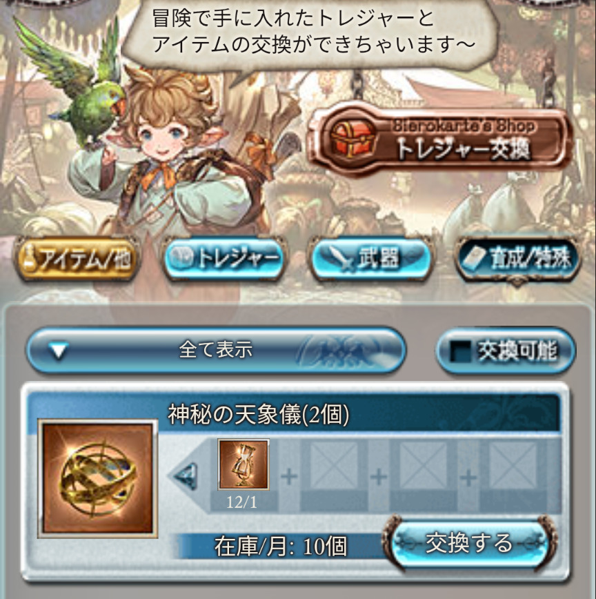 神秘の天象儀(2個)と刻の流砂1個を交換できます。