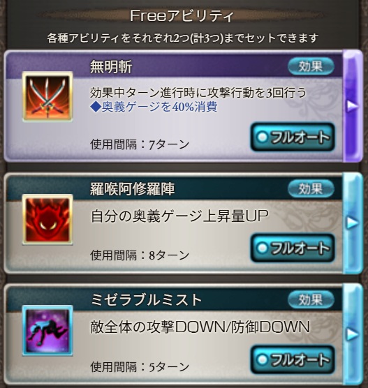 Freeアビリティは無明斬、羅喉阿修羅陣、ミゼラブルミストをセット。
